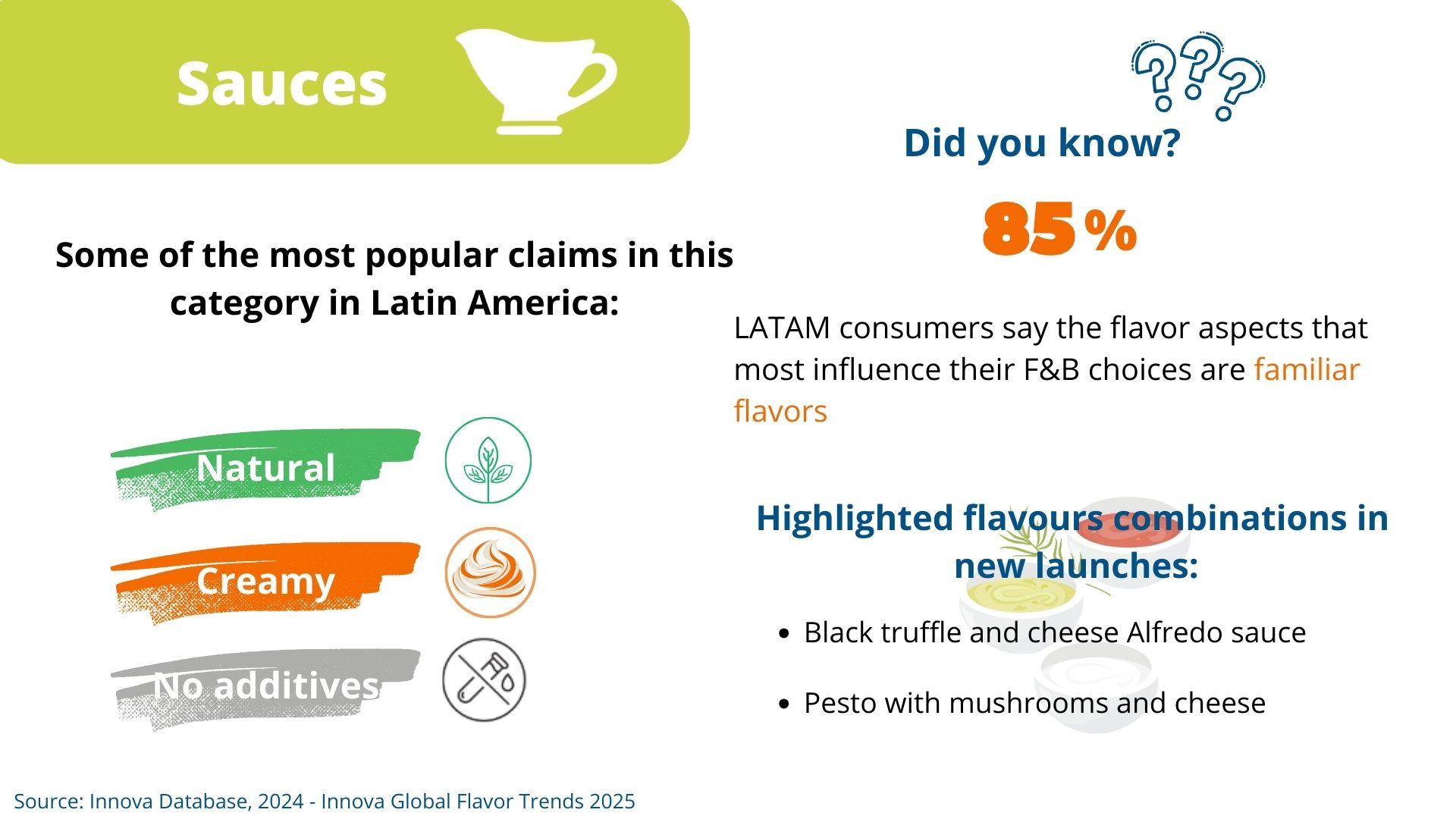 - The search of clean label options, simpler ingredient lists and healthier formulations, in formulations with less sugar, fat and salt has given rise to a growth in opportunities to innovate in sauce flavours.